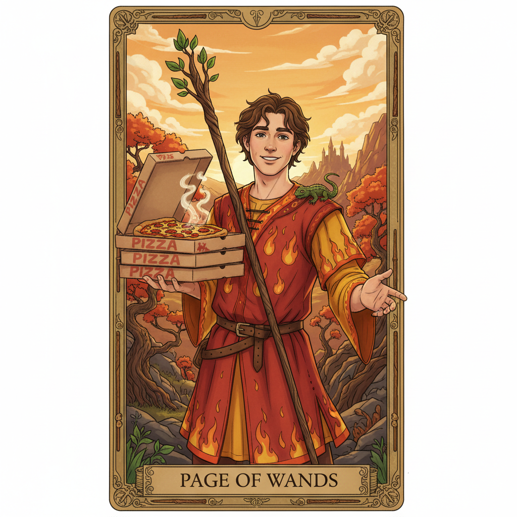 The Page of Wands clutches a stack of pizza boxes, having barely escaped being assaulted by Page of Swords. “I have pizza,” he announces, and smiles, because everybody loves pizza and vicariously, that means everybody loves him.