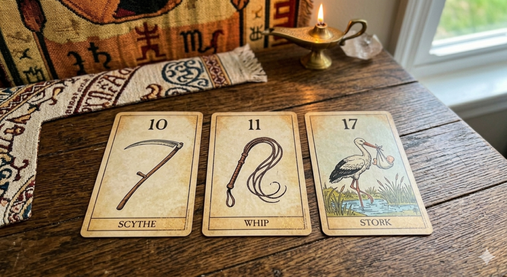 The Whip, paired with the Scythe and considered in context with our Tarot reading, indicates extreme harshness. The Stork is positive change. WHAT?